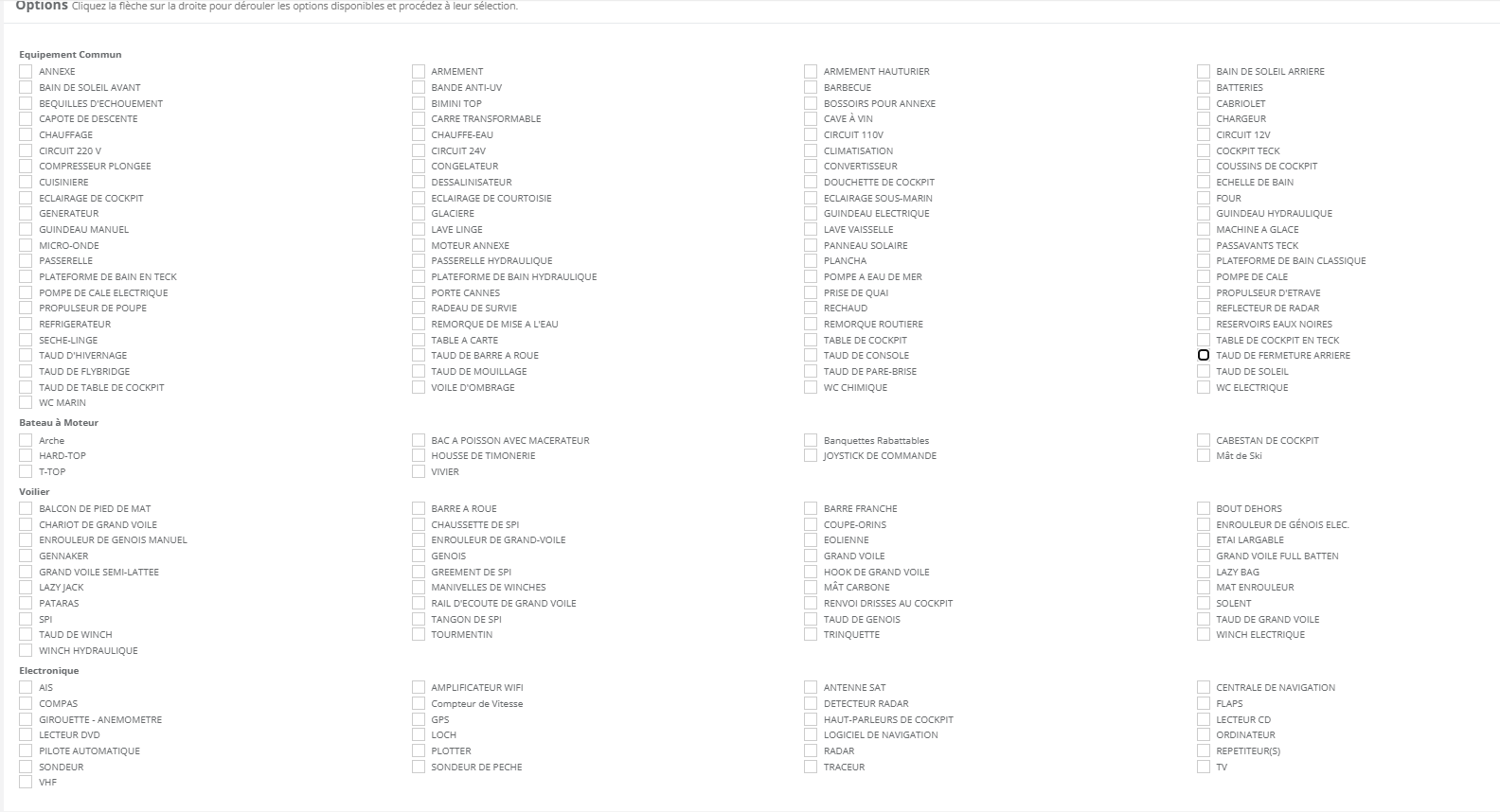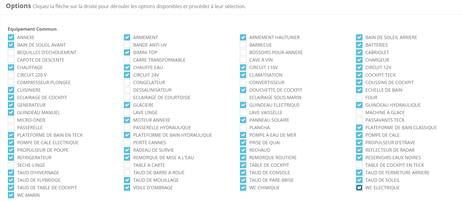 Annexe, Cabriolet, Circuit 110V, Cuisinière, Guindeau manuel, Plateforme de bain en teck, Plateforme de bain hydraulique, Pompe à eau de mer, Radeau de survie, WC chimique